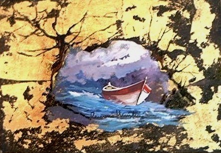 Pittore: Romano Mussolini "Barca" tecnica: olio fondo oro su tela - cm.35x50